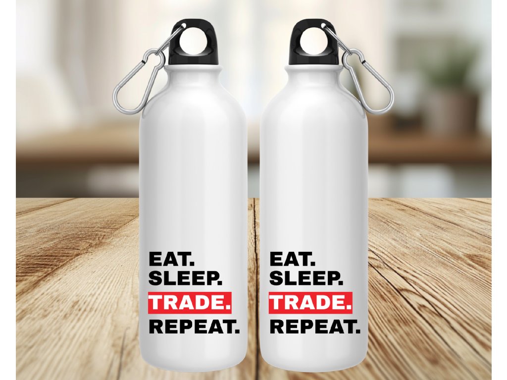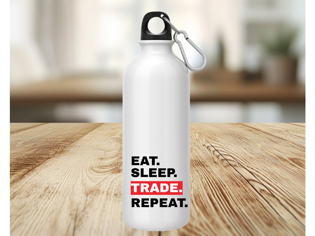 Stylová tradingová lahev na pití s mottem EAT. SLEEP. TRADE. REPEAT. 💹 Lehká, odolná a s potiskem z obou stran – ideální na stůl, do kanceláře i na cesty.