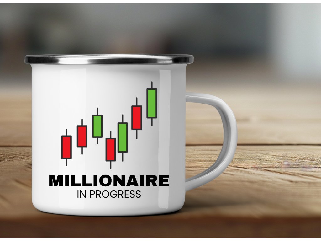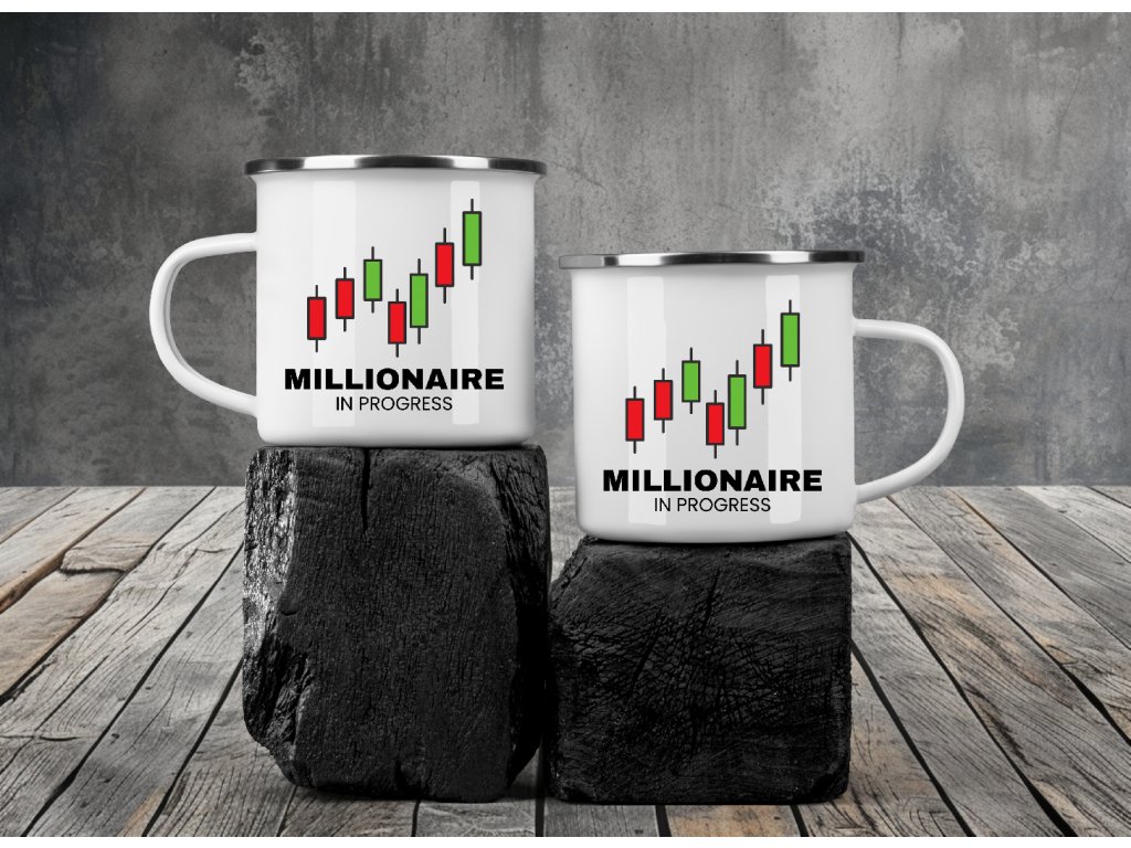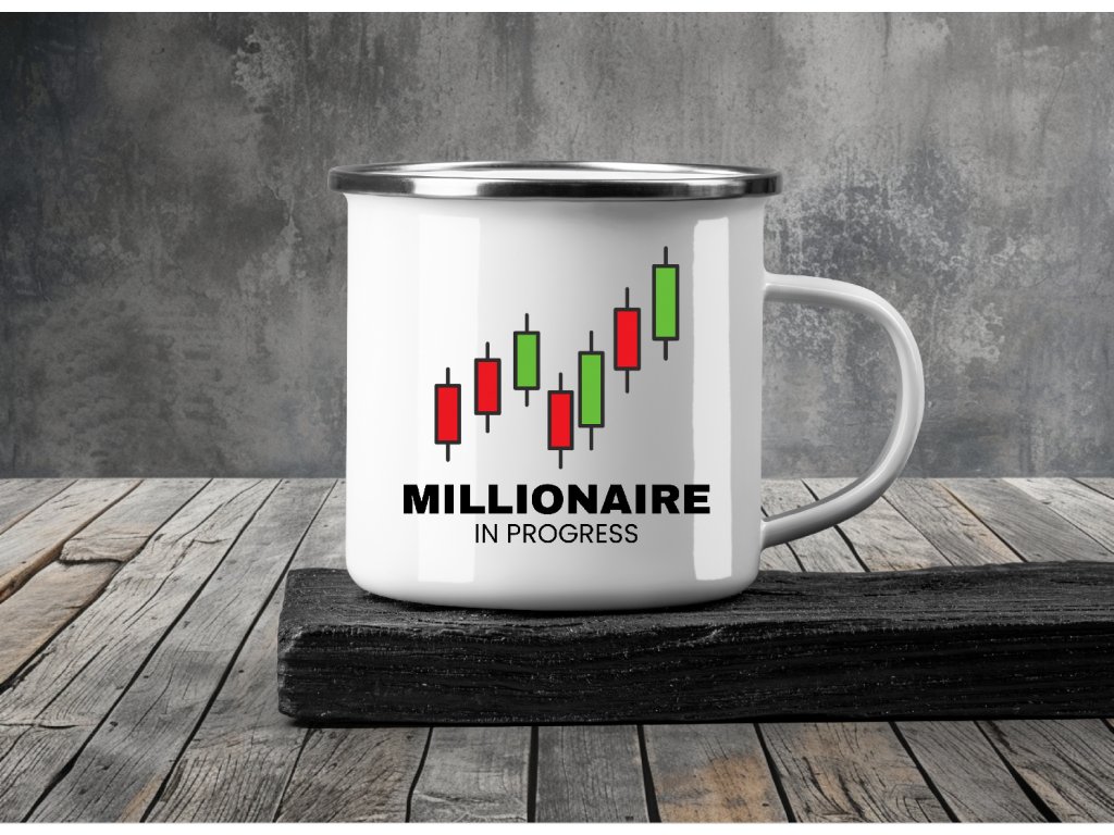 Každý trader začínal stejně – s vizí, disciplínou a kávou po ruce ☕ Tento tradingový plecháček s motivem Millionaire in Progress ti bude denně připomínat, že úspěch je proces. Zelené a červené svíčky symbolizují tržní realitu – někdy zisk, jindy ztrátu, ale vždy pokrok vpřed.