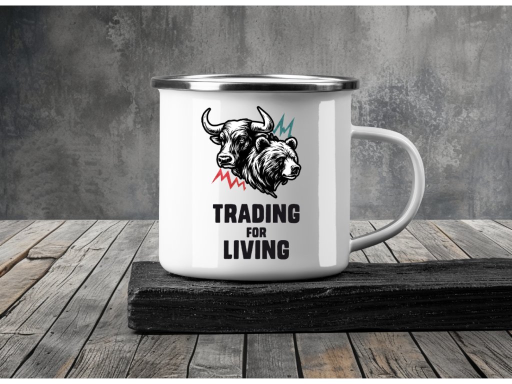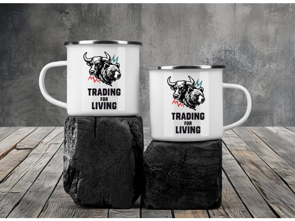Trading for Living 🐂🐻 Smaltovaný plecháček pro tradery, kteří žijí tradingem – styl, síla a motivace v každém doušku. CzechWealth Merch