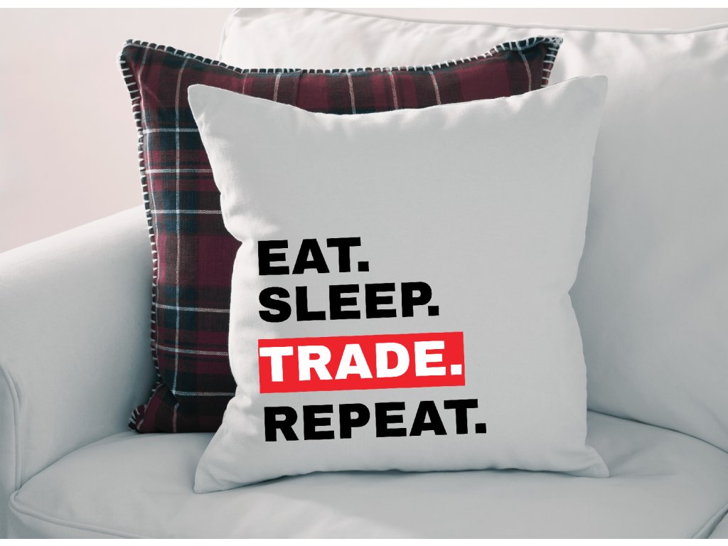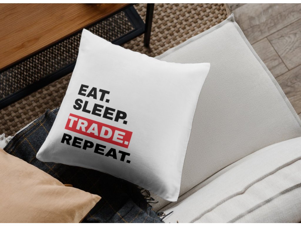 Polštářek Eat. Sleep. Trade. Repeat. vystihuje tradingový mindset naprosto přesně. Jednoduché, úderné sdělení, které zná každý trader – jíst, spát, obchodovat… a znovu. Žádná omáčka, jen realita trhu.