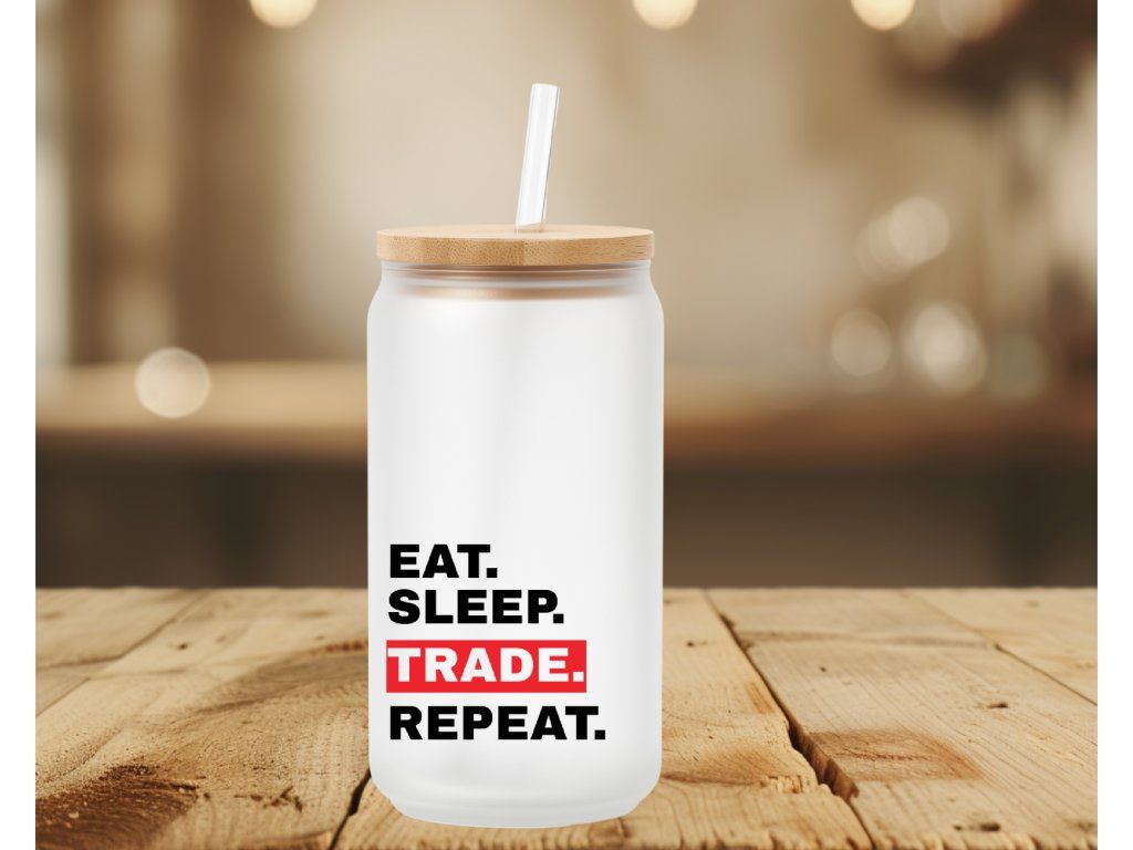 Výrazný nápis Eat. Sleep. Trade. Repeat. je otištěn z obou stran sklenice, takže je vždy perfektně viditelný – ať už ji máš v ruce, na stole nebo otočenou jakýmkoliv směrem. Červeně zvýrazněné slovo TRADE přitahuje pozornost a dává jasně najevo, co je středobodem celého dne.