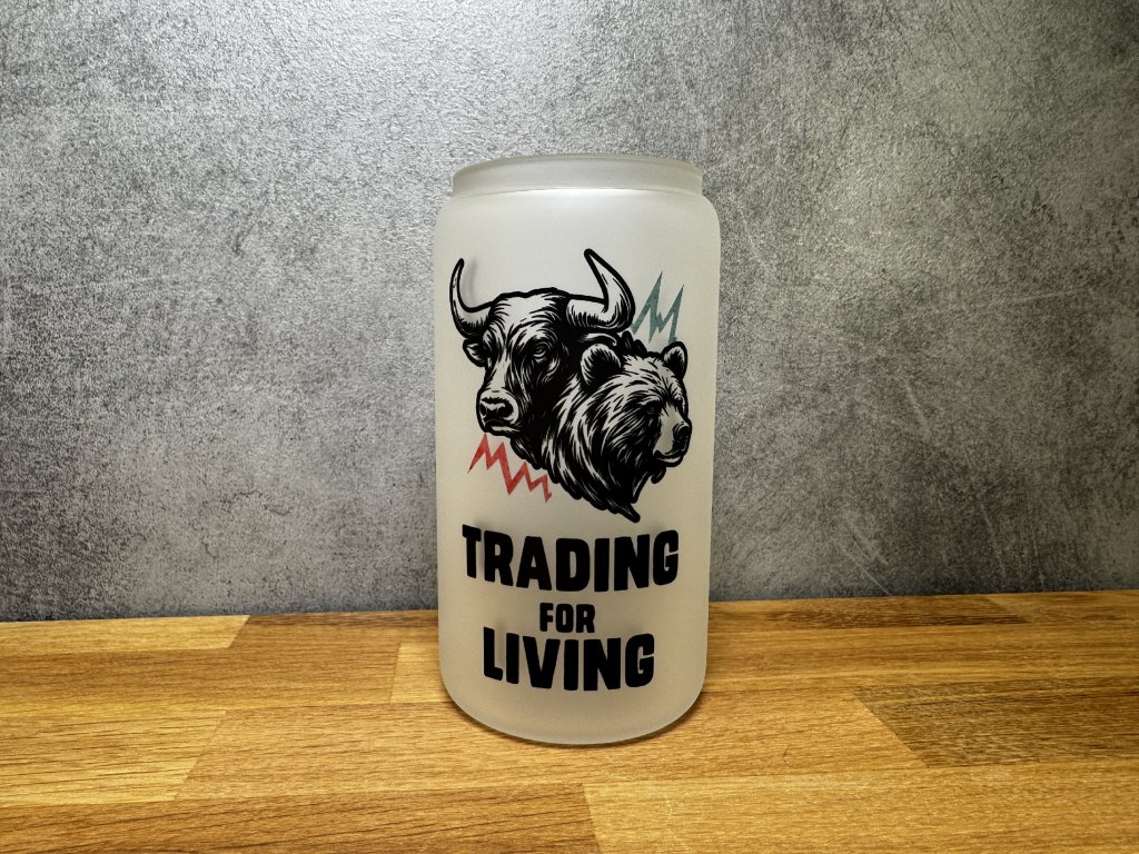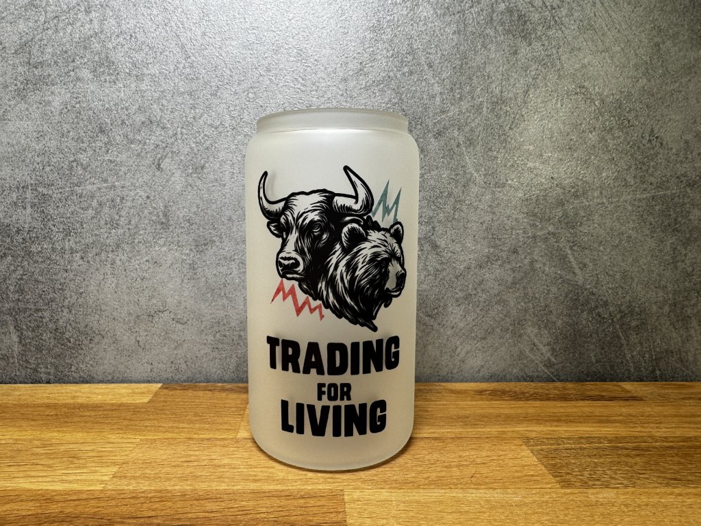 Matná sklenice s motivem Trading for Living – ideální pro každého tradera. Elegantní, odolná a skvělá pro studené i teplé nápoje.